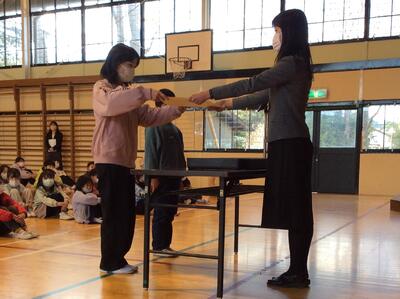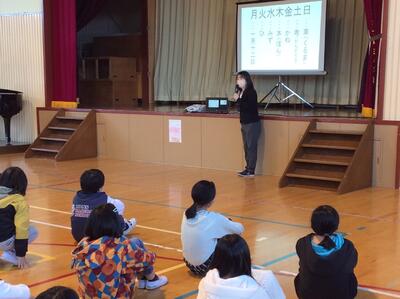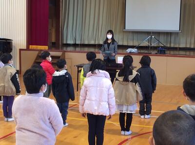 校長先生から2学期に頑張ったことや冬休みの過ごし方についてのお話を聞きました。また、養護教諭の鈴木先生からは、冬休み「は・か・せ」に気をつけて生活しましょうというお話を聞きました。