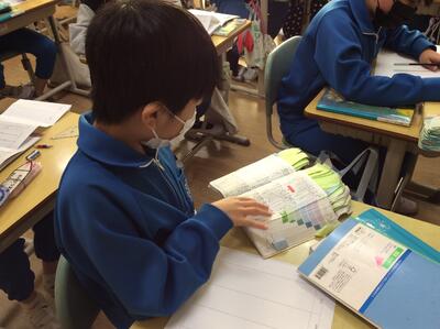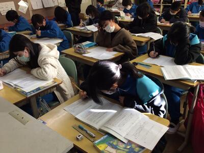 5年生の国語の様子です。今日は「自分の主張、主張を支える理由、根拠、予想される反論、それに対する自分の考え、根拠、まとめ、自分の主張」という構成で意見文を書きました。24時間営業のスーパーマーケットは必要か、優先席は必要かなど、それぞれに自分の意見を文章にすることができました。