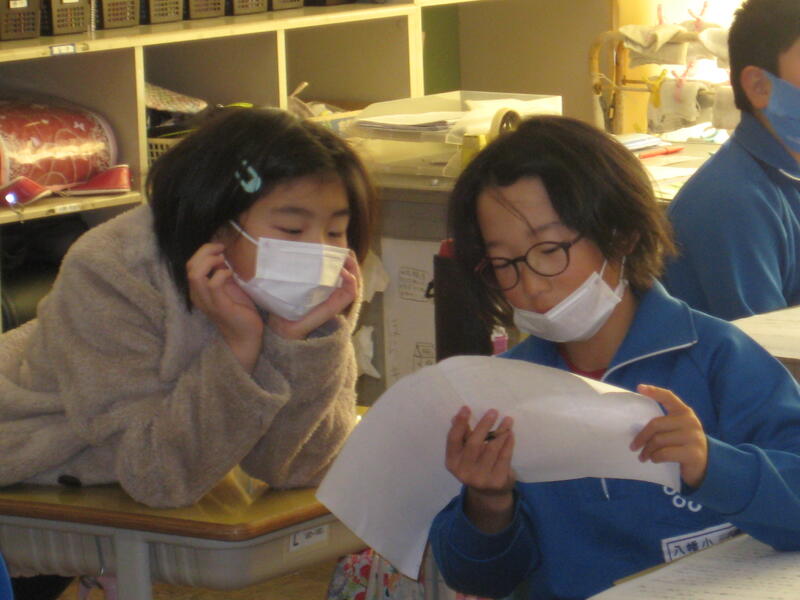 構成メモを書き終わた子どもたちは、お互いのメモを見せ合い、