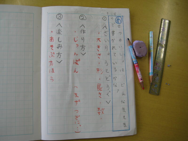 今日の学習のめあては「せつめいしょはどんなまとまりで書かれているかな」です。