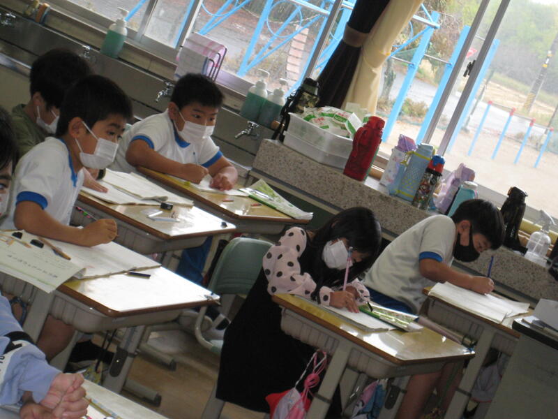 下書きが書けたら、先生に見てもらいます。正しい書き方ができたらカードに清書をします。
