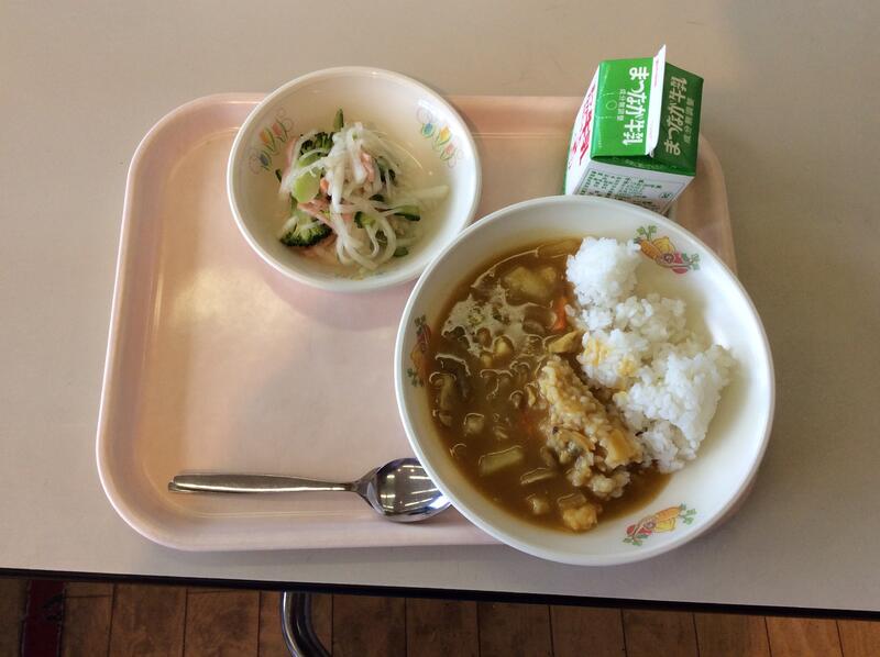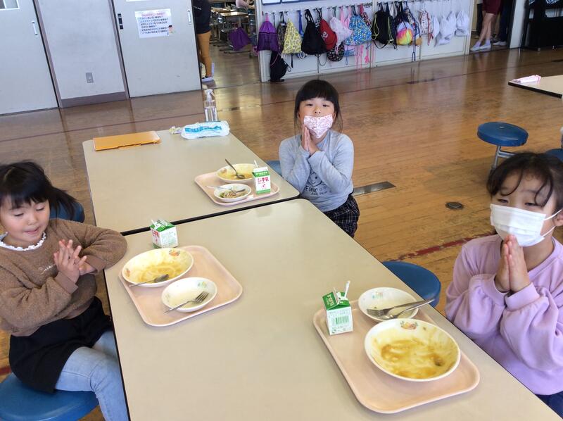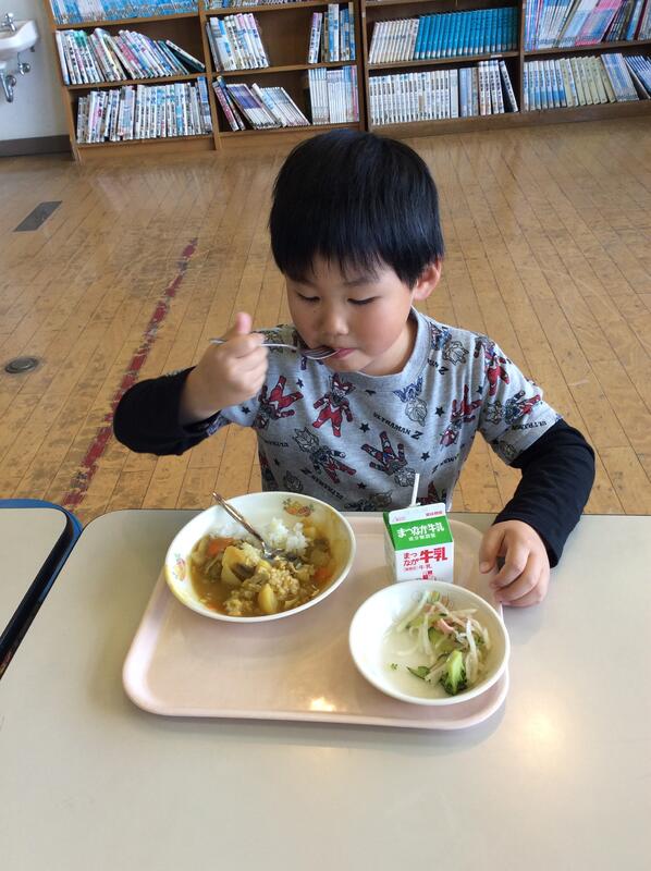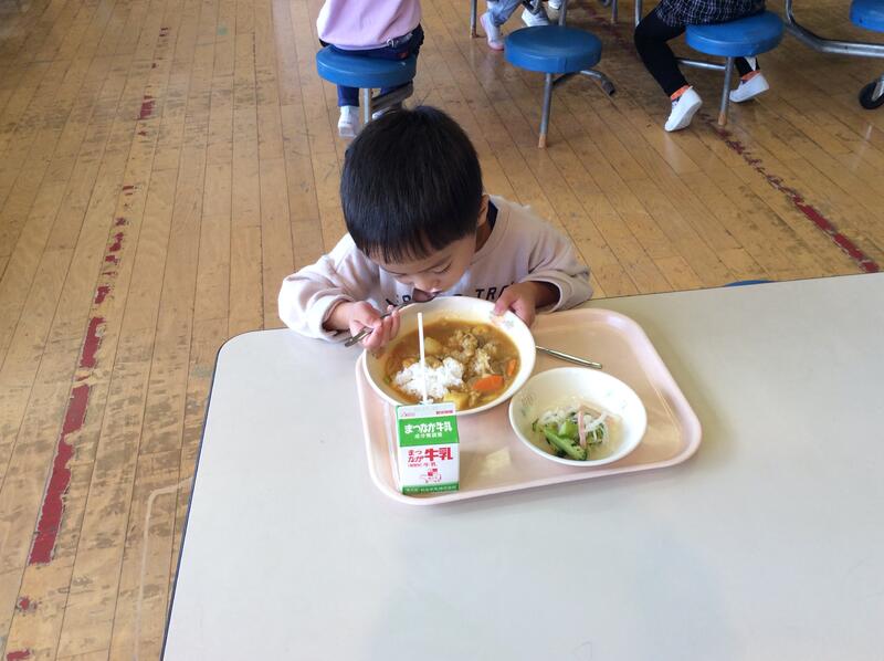 八幡幼稚園の年長さんを対象に給食試食会を実施しました。今日のメニューは「牛乳」「シーフードカレー」「大根と」ハムのサラダ」でした。苦手な野菜に友達とチャレンジしてみる姿や、おいしいとたくさんおかわりする姿がみられました。小学校ではいろいろなメニューの給食がでます。楽しみにしていてくださいね!
