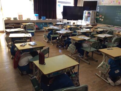 本日の緊急地震速報訓練の様子です。警報と同時にすばやく避難行動をとれました。