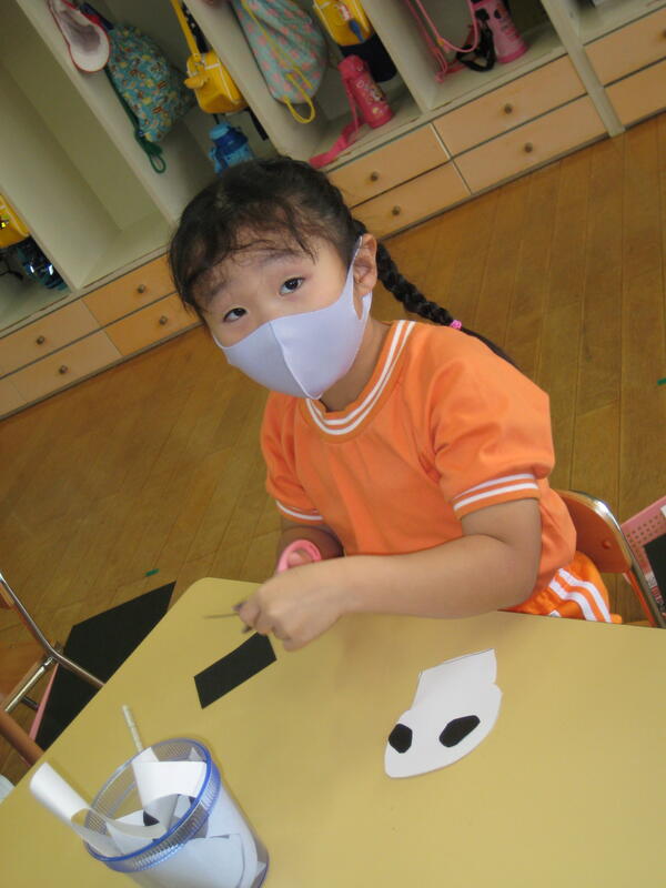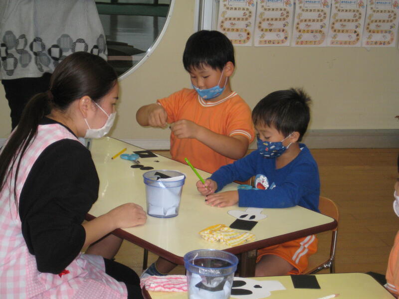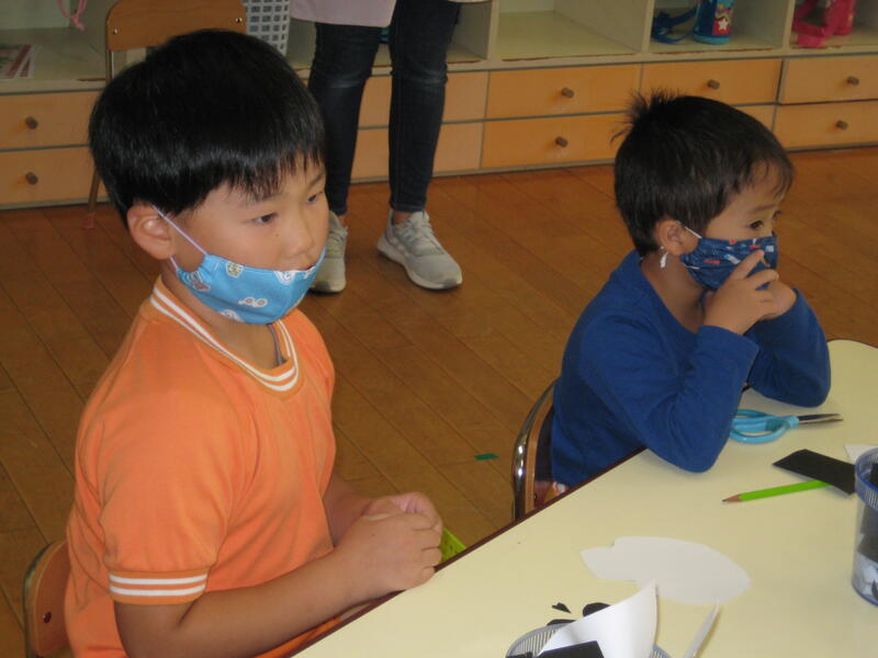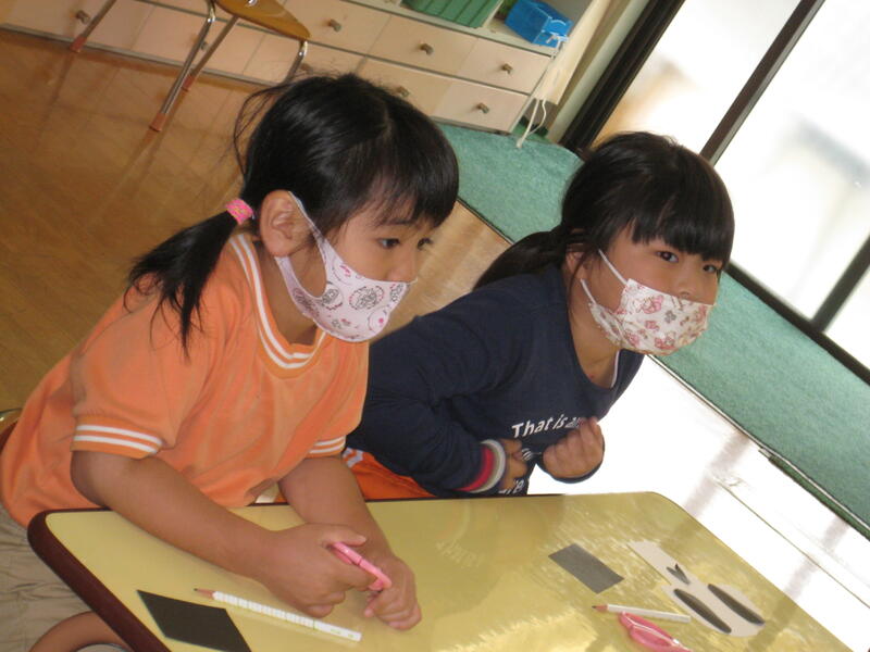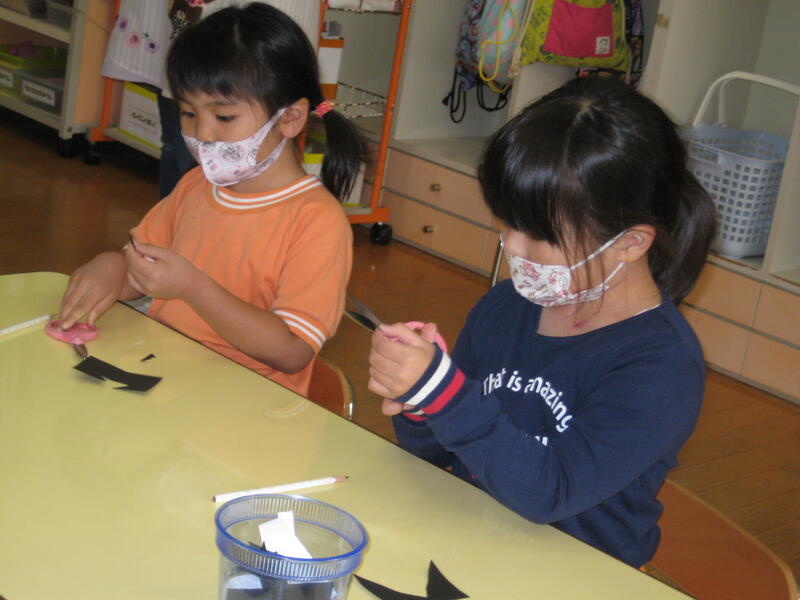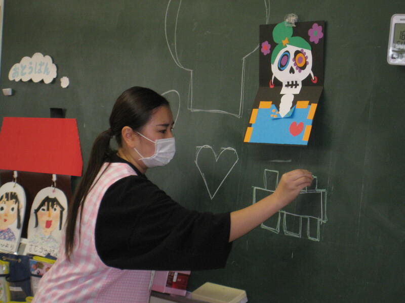 先生の話をしっかり聞きながら、ガイコツの目や鼻、口などをつくりました。