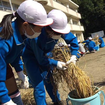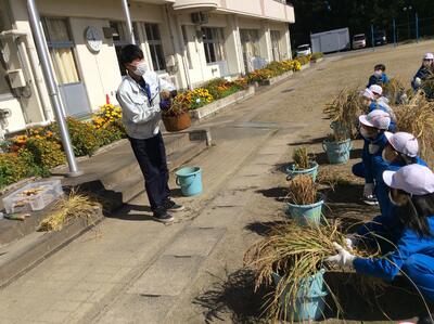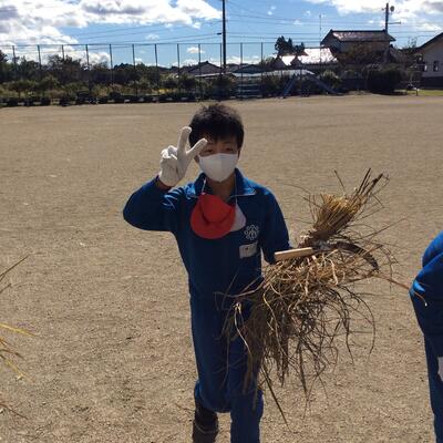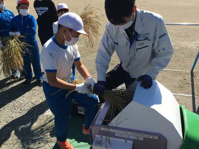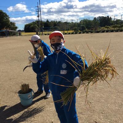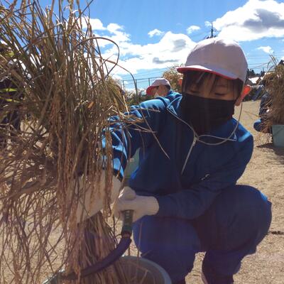 5年生の稲刈りの様子です。子どもたちは鎌の扱い方に苦戦しながら、一生懸命収穫していました。本日は「脱穀」まで終わりましたが、この後、「籾すり」「精米」という行程を経て、普段食べている白米になります。完成するのが楽しみですね。