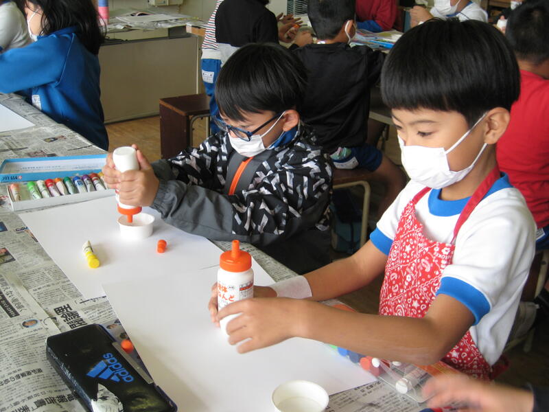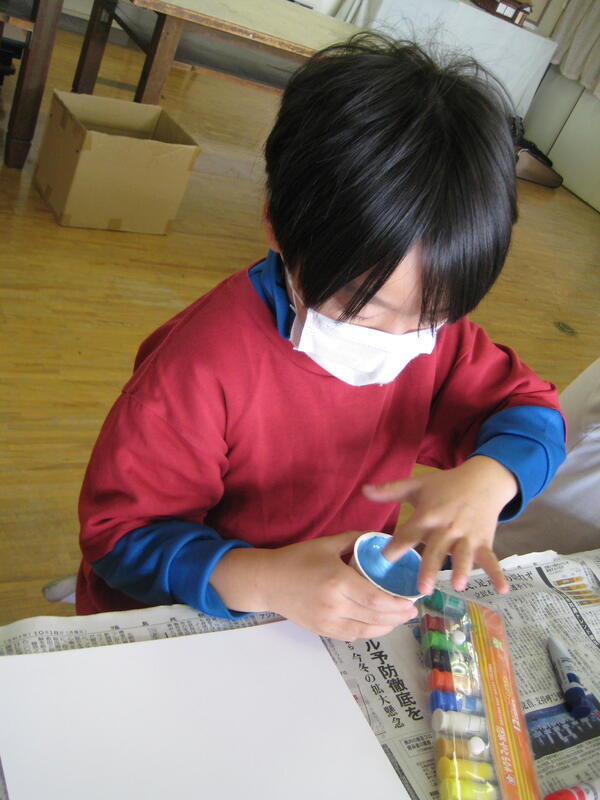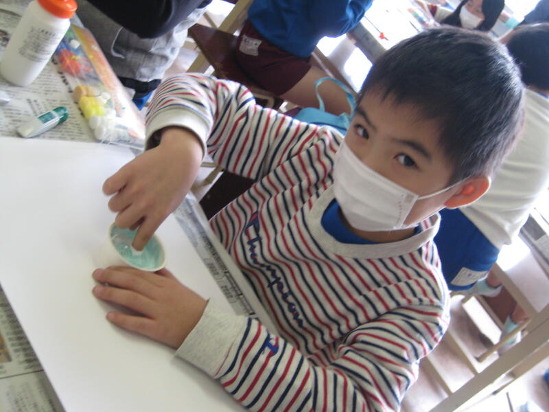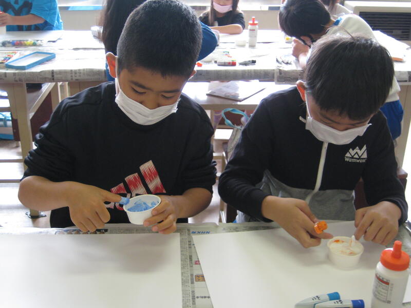 子どもたちは液体粘土の感触を味わいながら、絵の具を混ぜて好きな色を作ります。