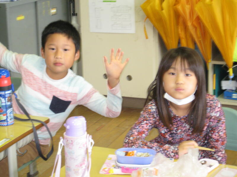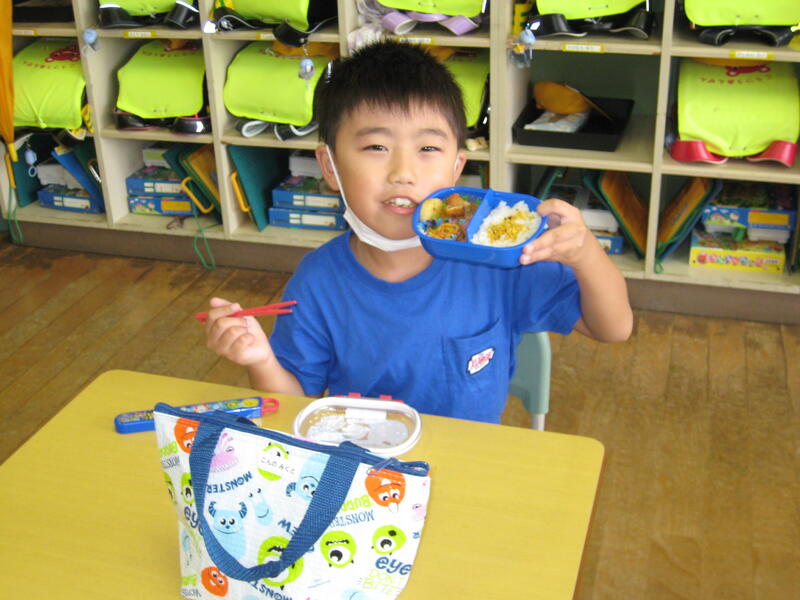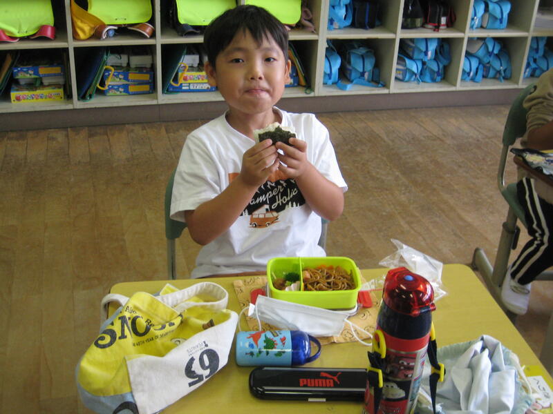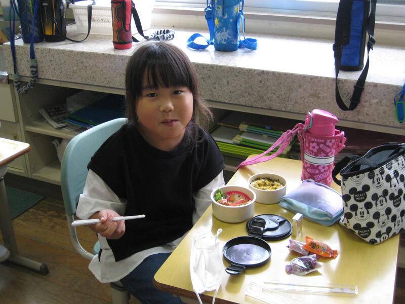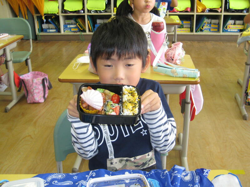 早めに学校に帰ってきた1年生は、早めにおいしいお弁当をいただきました。