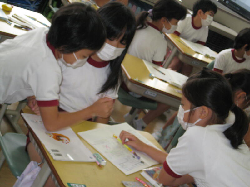 言葉の意味やだれが何をしたかをみんなで確認しながら学習を進めます。