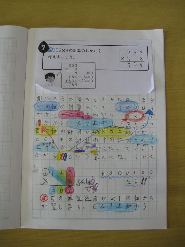色別にして工夫をしています。説明と筆算の色を合わせるとより分かりやすいですね。