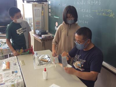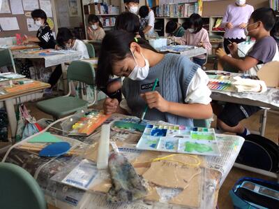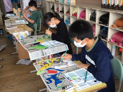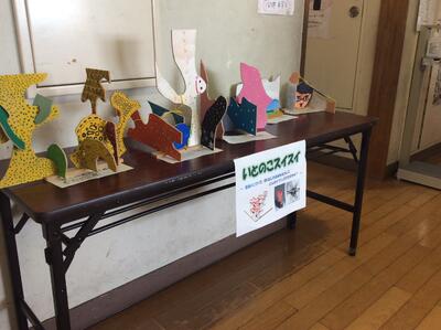 5年生の図工の様子です。電動のこぎりで切り出した曲線を生かして。オブジェづくりをしています。今日は木片に色をぬり、思い思いの形に組み立てていました。授業後には個性豊かですてきなオブジェが並んでいました。