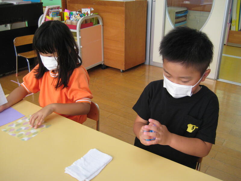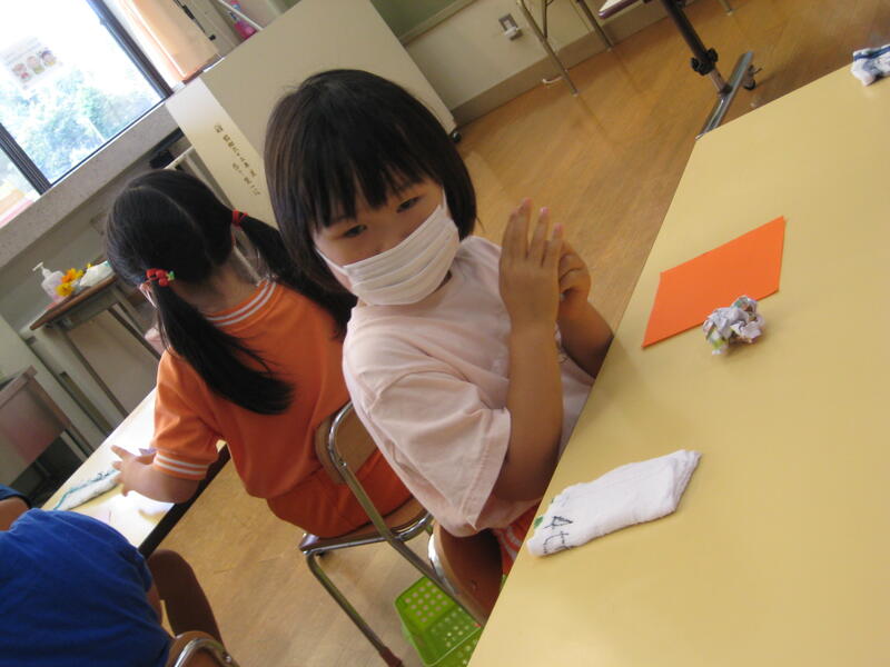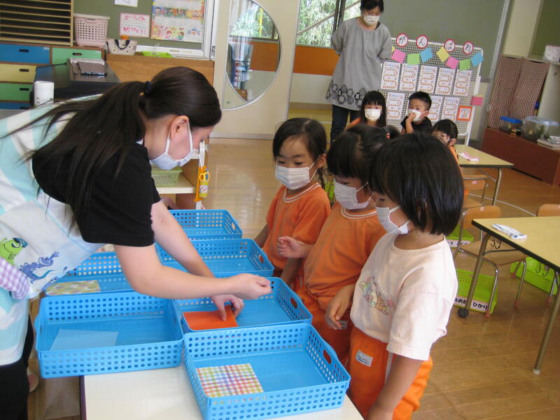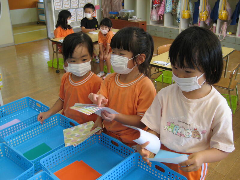 話を聞いた後は、自分が作りたいミノムシの色の折り紙を選びます。