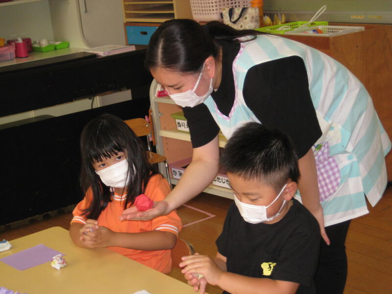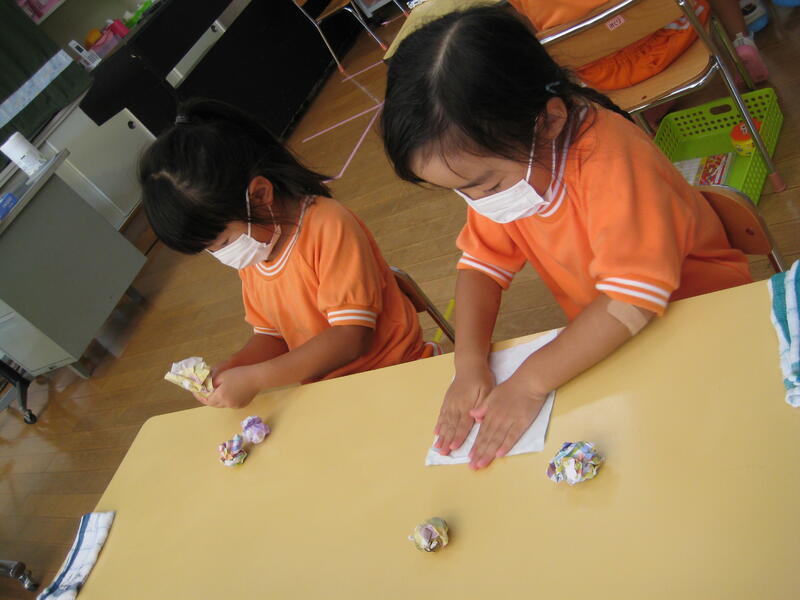 今日は、幼稚園のさくら組でミノムシづくりをしました。