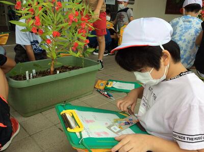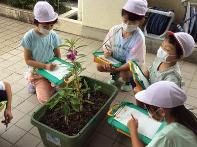3年生の理科の様子です。夏休みを経て大きく育ったホウセンカを観察しました。子どもたちは花の色や茎の高さの違いに気付き、驚いているようでした。