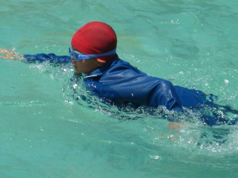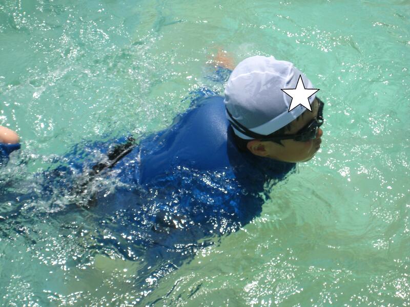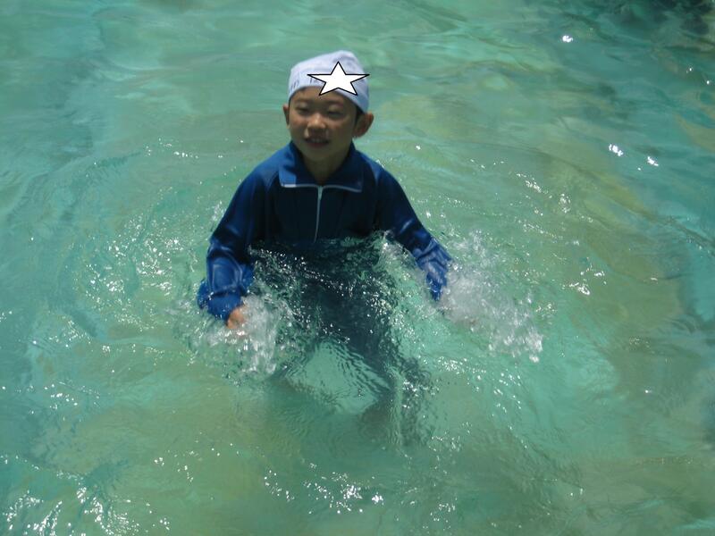 背中に水をかけて水に慣れた後は、シャワーの噴水の下をくぐります。