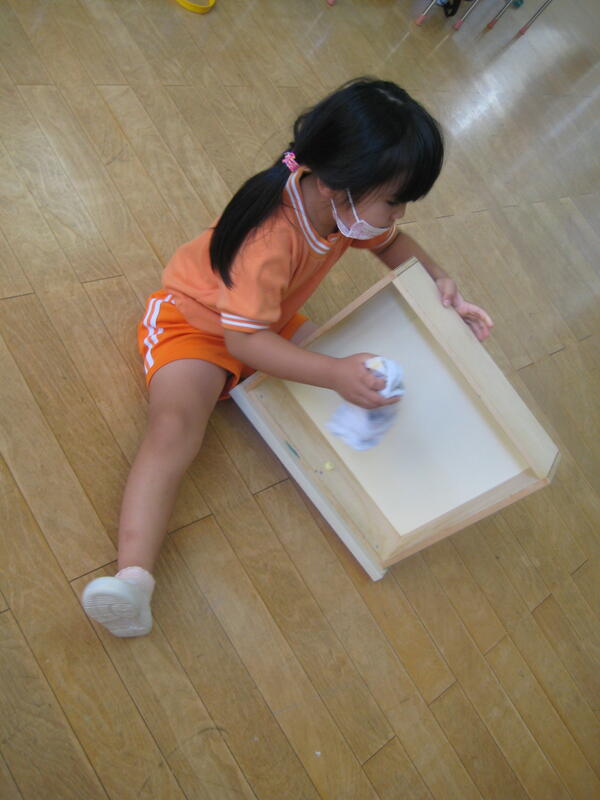 自分で雑巾をしぼることにも挑戦。ロッカーや引き出しの中をきれいに拭き掃除をしました。