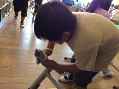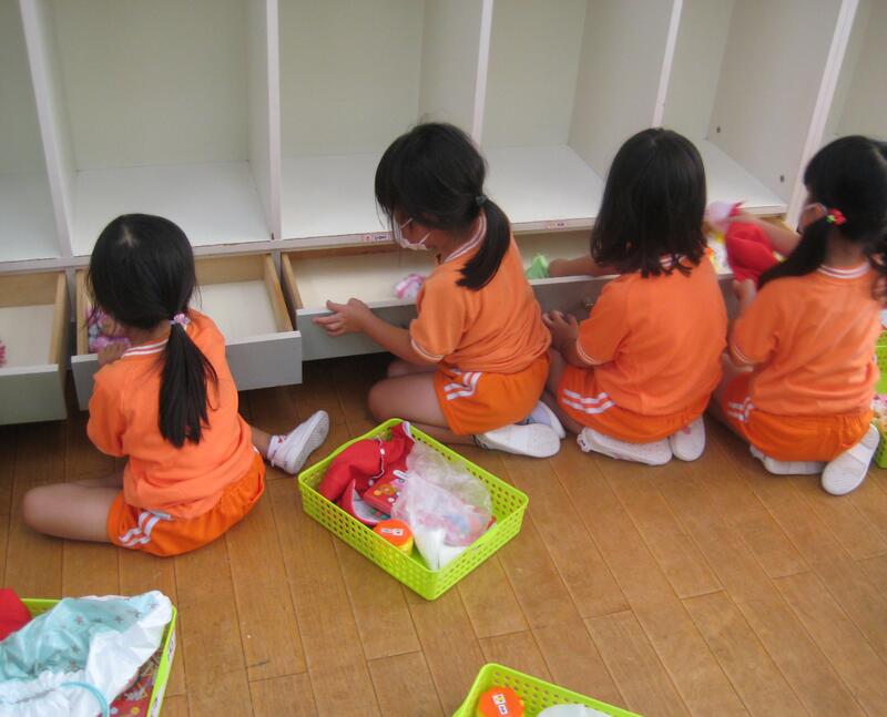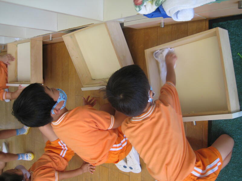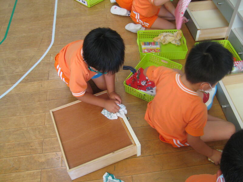 幼稚園では、夏休み前にホールや教室にあるもの、ロッカー等の大掃除をしました。