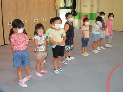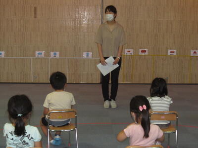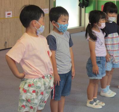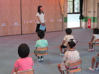 園長先生から夏休み中の過ごし方やに気をつけてほしいことの話を聞いた後、園児1人1人の1学期の思い出を発表しました。また、保健の先生からは夏休み中の健康管理についての話を聞きました。