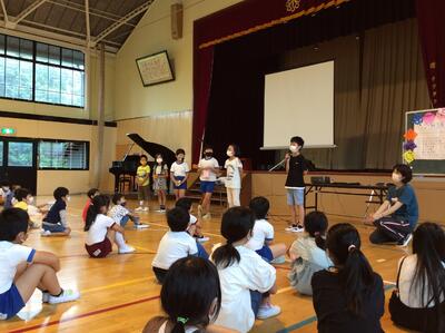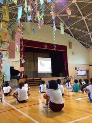 本日2校時目に七夕集会がありました。まず校長先生のお話にて、「たなばたさま」の歌について演奏を交えながら教えてもらいました。その後は、企画委員会による「たなばたのおはなし」の朗読、各学年の代表による願い事発表があり、とてもすばらしい会になりました。今日の七夕集会のおかげで、楽しみながら七夕について知ることができました。企画・運営をしてくれた企画委員会のみなさんお疲れ様でした!