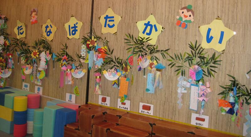 ピンクの帽子が織姫、水色の帽子が彦星、緑の帽子が笹です。