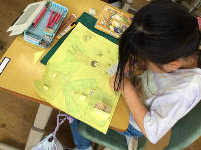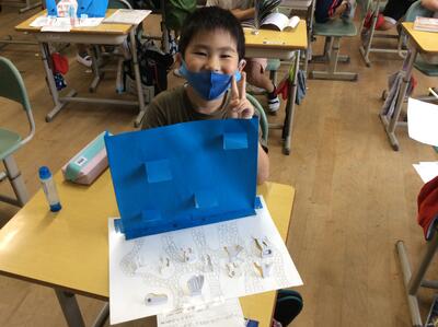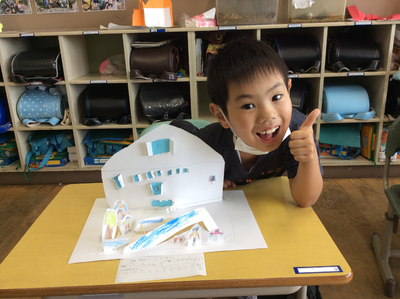 2年生の図工の様子です。カッターナイフを上手に使い、作品を作りました。窓を開けたり、草や木を切り取って立たせたり工夫して作品を仕上げました。