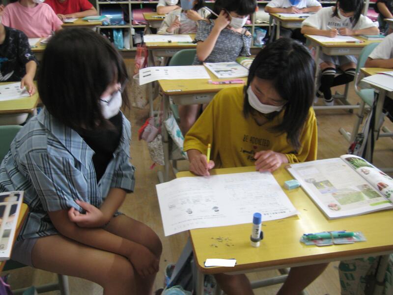 プリントを使って、1学期に習った理科の学習内容のまとめをしています。