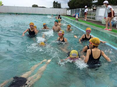 本日、5・6年生の水泳の授業がありました。今年度はじめてということで水に慣れることを目標に水をかけあったり、プールを歩いたりして過ごしました。楽しく水に親しむことで水泳学習への意欲を高めることができました。