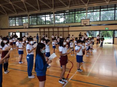 本日業間にプール開きが行われました。プール開きの歌や各学年の代表者からのめあての発表により水泳学習への意欲を高めました。今年はたくさんプールに入れるといいですね!