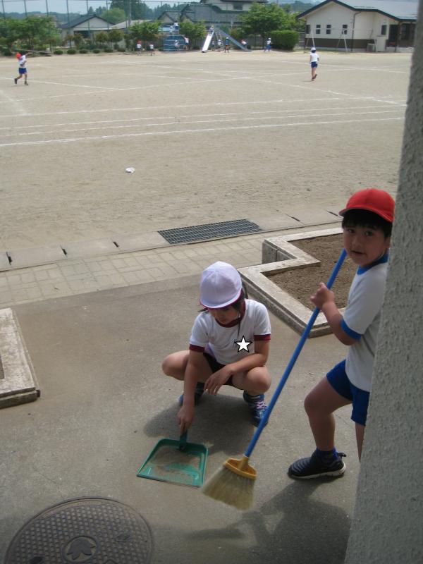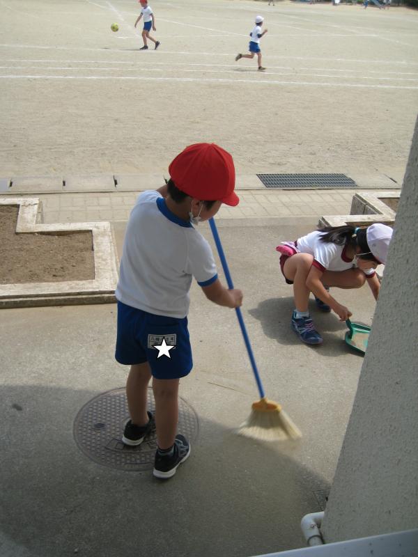 ほうきで掃く人、ちりとりで砂を集める人、自分たちで役割分担をして