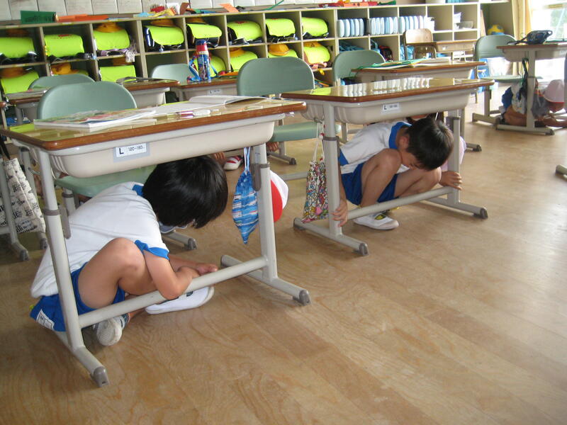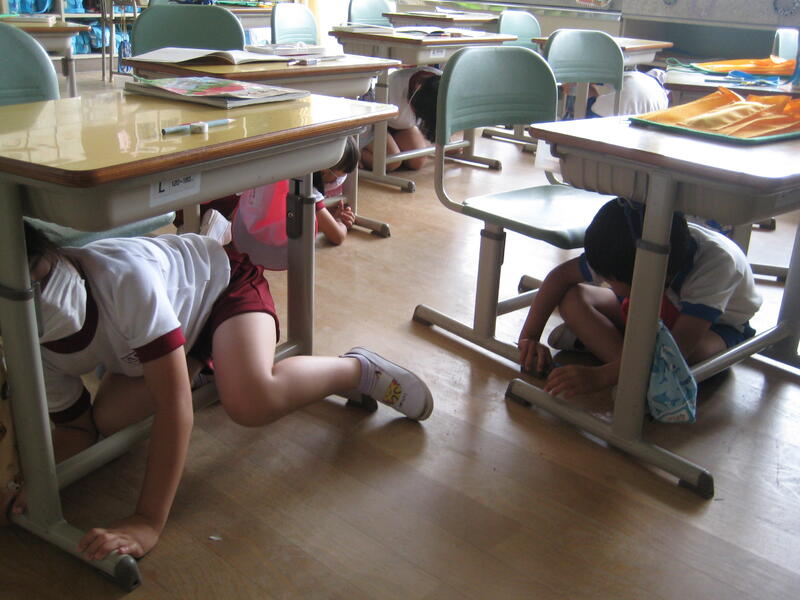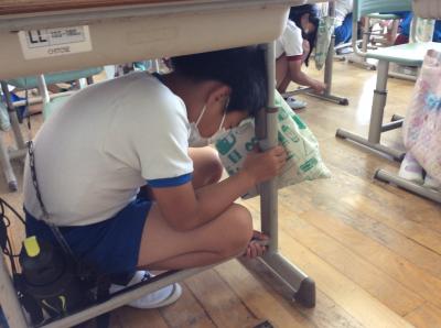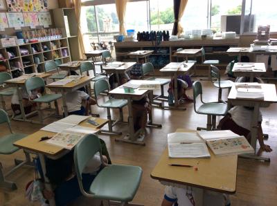 本日、10時に緊急地震速報訓練がありました。子どもたちは放送と同時に机にすばやく身を隠すことができていました。日頃の訓練で学んだことが生かされており、大変すばらしい対応でした。