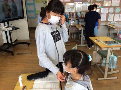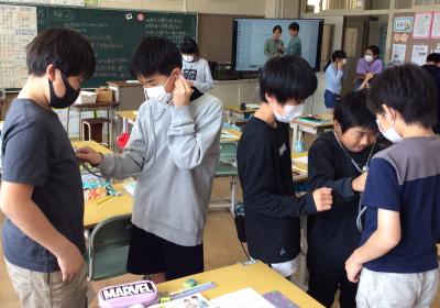 6年生の理科の様子です。血液を送り出す心臓のはたらきを学ぶため、聴診器を使って拍動を感じました。自分の心臓の鼓動を感じ取るためにいつも以上に集中して耳を澄ませる児童の姿が見られました。
