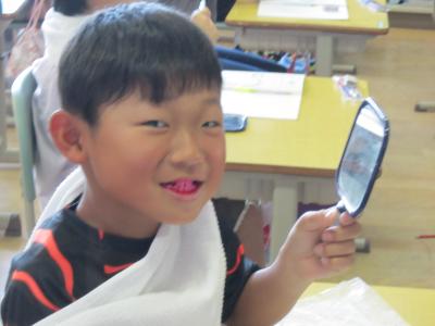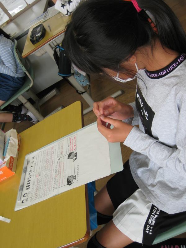 養護教諭の鈴木先生と一緒に虫歯になる原因の勉強をした後、染め出し液を使い磨き残しの箇所を確認しました。