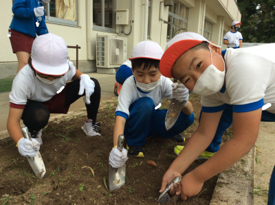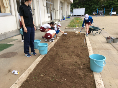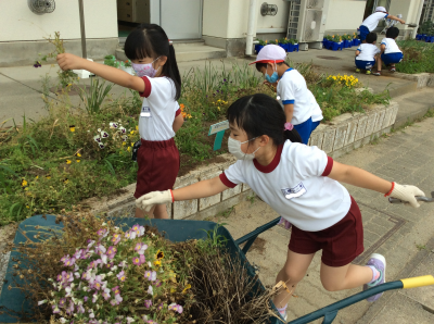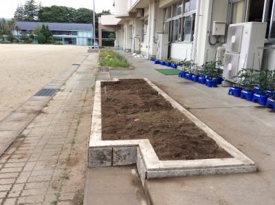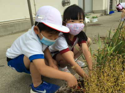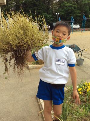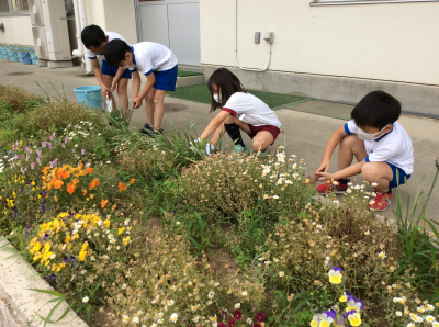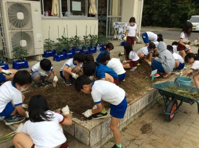 今週1週間は花だん除草週間になっています。まずは1年生の様子です。スコップを使いながら一生懸命除草を行いました。1時間しっかりと除草を行ったおかげで花だんがだいぶキレイになりました。1年生のみなさん、お疲れ様でした。