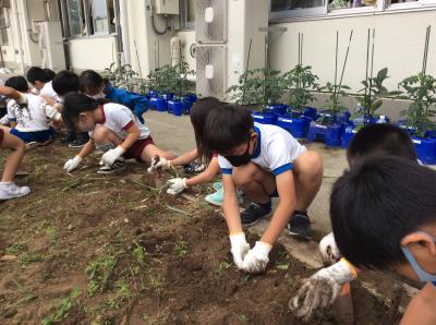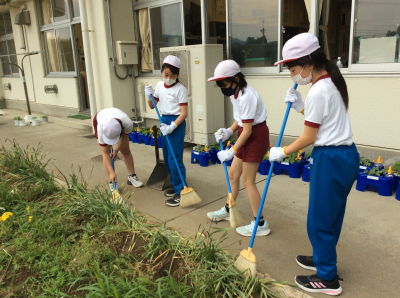 5年生の除草の様子です。5年生は密を避けつつ効率を上げるため、前半後半に分かれて除草を進めました。高学年らしくてきぱきと作業を進め、余った時間には1・2年生のベランダの掃き掃除も行ってくれました。さすが5年生ですね、すばらしいです!
