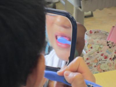 ピンクに染まった歯をブラッシングし、歯の正しい磨き方の勉強をしました。