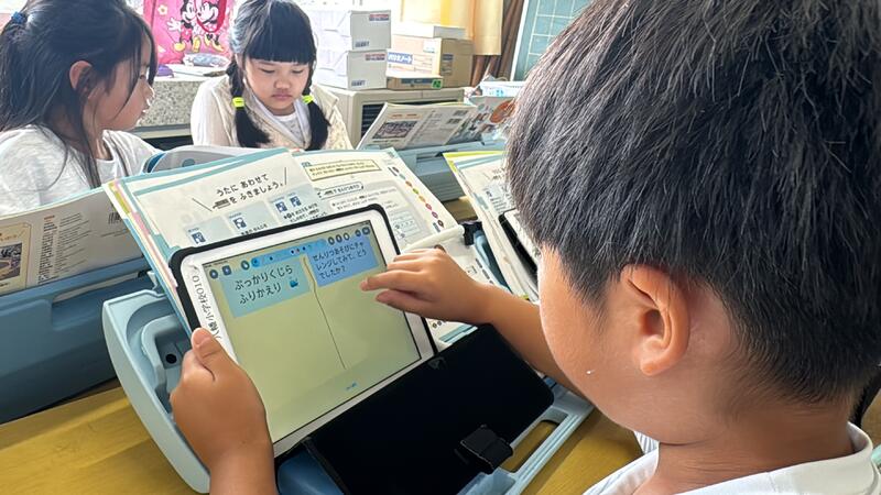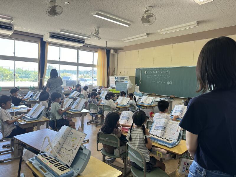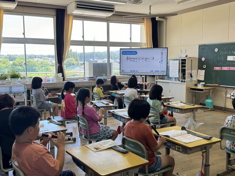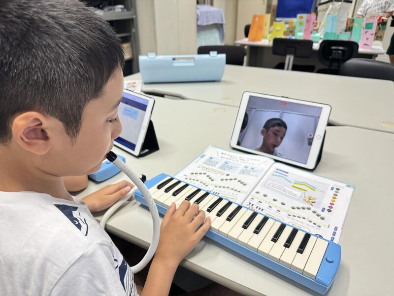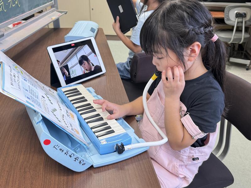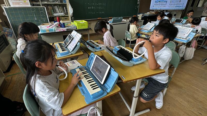 2年生は、鍵盤ハーモニカで旋律遊びに取り組むときも、教師がデジタル教科書に旋律遊び用のwebアプリで副旋律のつくり方を伝え、子どもたちは紙の教科書に記載しているQRコードで、教師と同じアプリを使って副旋律づくりを楽しむことができました。