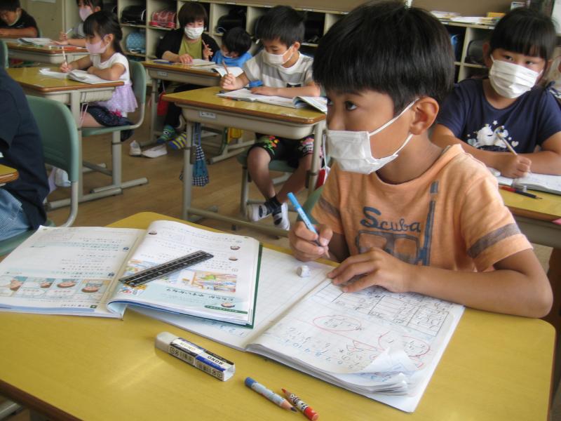 黒板に書いてある例文を参考に、自分でノートに説明を書きます。