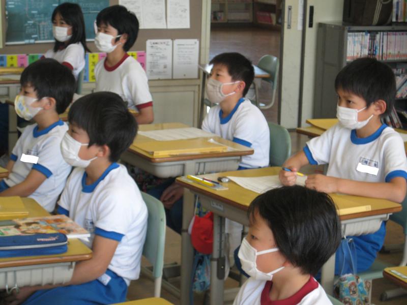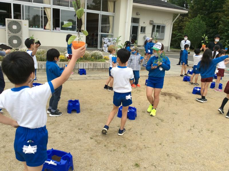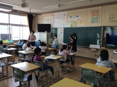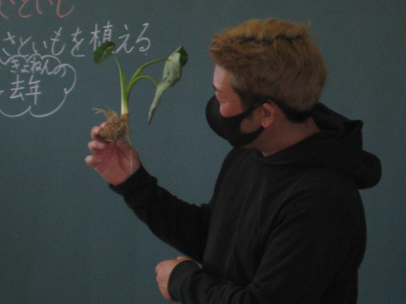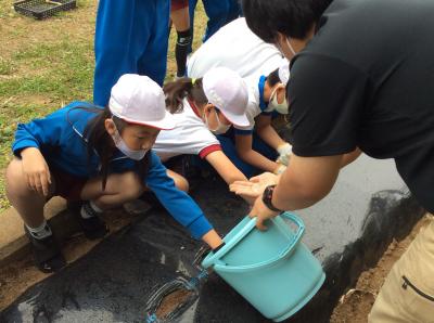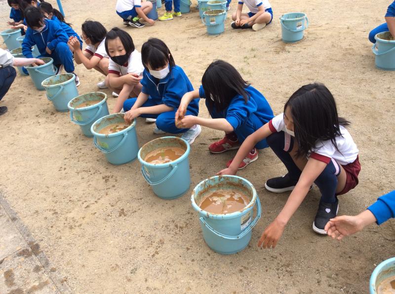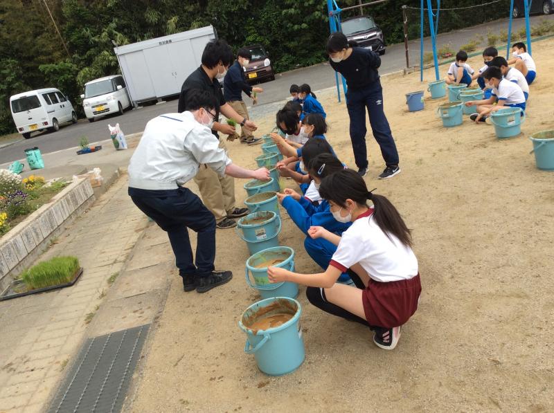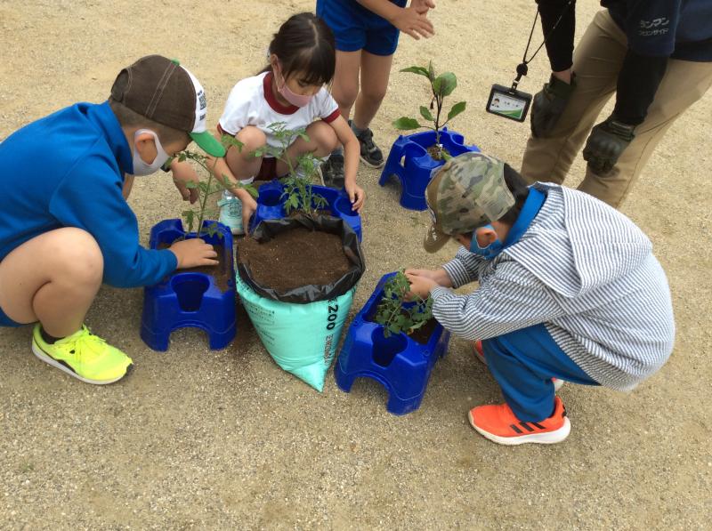 本日はJAの方々にきていただき2、4年生は野菜の苗植え、5年生はバケツ稲をしました。