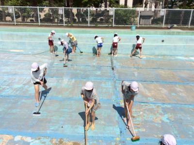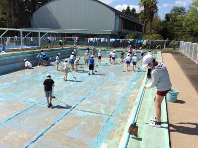 本日、5校時目に5・6年生がプール清掃をしてくれました。プールの中のゴミをほうきで掃いたり、プールの床や壁をブラシで磨いたりしっかりと仕上げていました。これで、今年も気持ちよく水泳の授業ができそうです。5・6年生のみなさんありがとうございました!