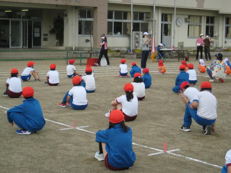 今日は、子どもたちの間隔を前後左右2メートルずつあけて整列し、