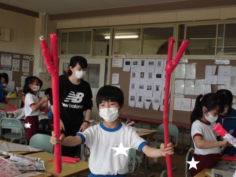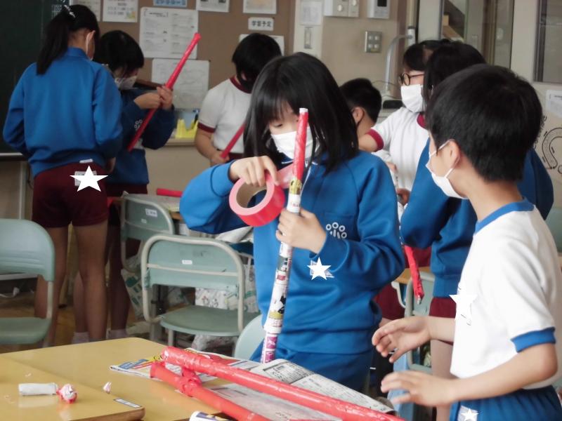 運動会に向けて、5年生は競技で使う道具を作りました。友達とペアになり,協力して作りました。
