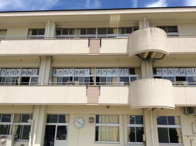 本日から校舎二階の窓にスローガンが貼り出されました。スローガンは6年生の代表者2名が心を込めて書いてくれました。「ファイト紅組!負けるな白組!あきらめずにやりとげよう!」このスローガンを胸に土曜日の運動会では、両チーム共に最後まであきらめずに頑張ってほしいと思います。