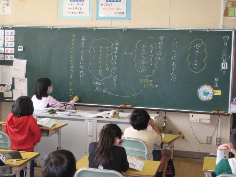 2年生の道徳の授業の様子です。ちくちく言葉や友達に言われていやな言葉を出し合った後,みんなでやさしさについて考えました。