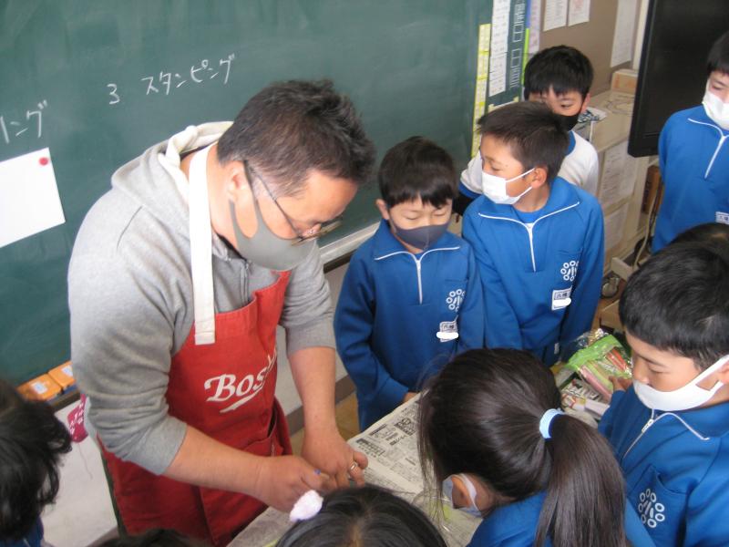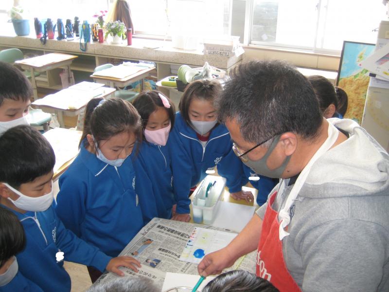 4年生の図工の学習の様子です。いろいろな用具を使って,絵の具で模様を描いていきます。使い方の説明を真剣に聞いています。どんなゆめもようになるか楽しみです。