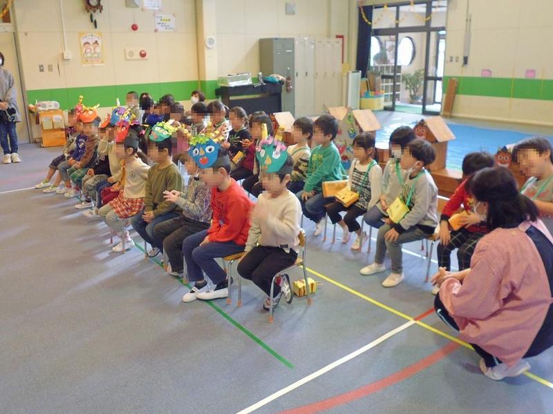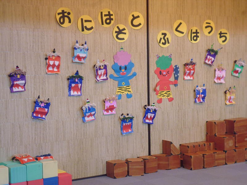 八幡幼稚園では,年間を通して季節の伝統行事を大切にする活動をしています。もちろん豆まき体験も行います。ちゅうりっぷ組のみなさんの鬼たち。強面で迫力がありますね。