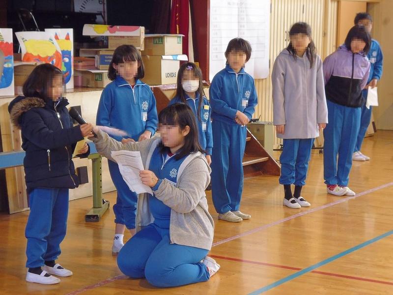 豆まき集会を開きました。はじめに,企画委員会の友達が,節分の由来を発表しました。なるほど,豆まきの歴史がわかったぞ!!