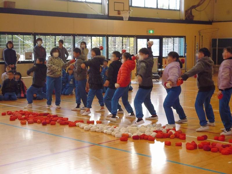 鬼の的に向かって紅白玉を投げます。今回は清掃班ごとに,落とした鬼の的の数とスピードを競いました。どの班の子も本気モード炸裂!!異年齢の交流って,本当に心が通い合っていいなぁ・・・