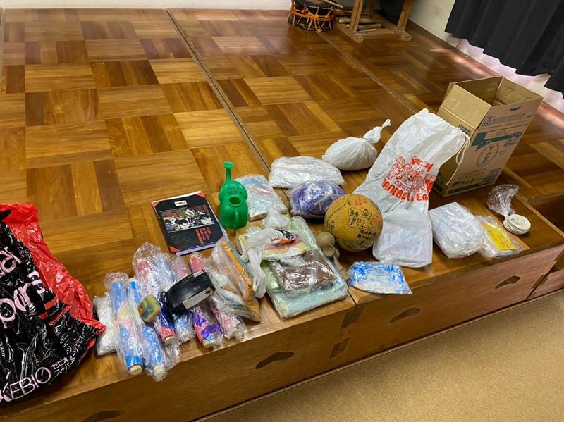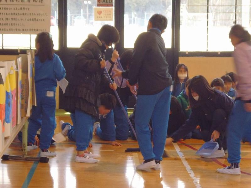 紅白玉が破れて中身が出てしまった場面。言われなくても,さっと集まって,みんなで協力しておそうじ。すばらしい八幡っ子の姿です。