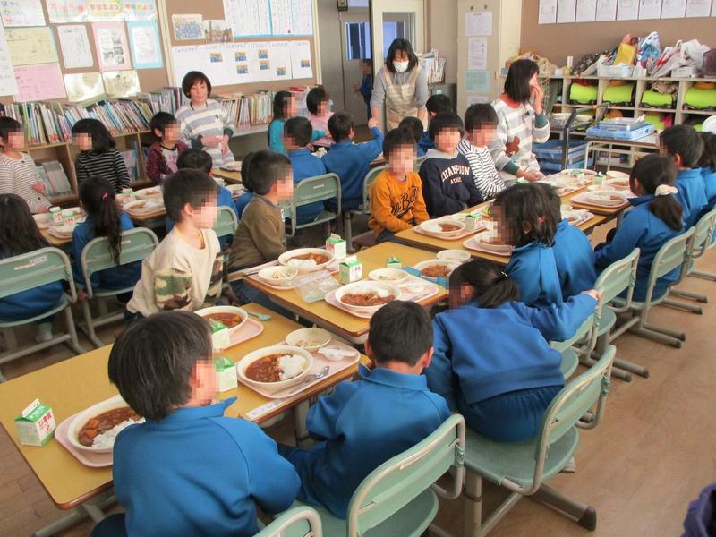 なわとび記録会が終わった1年生は,八幡幼稚園年長組のお友達と交流給食。この日は,ハヤシライス,大根とツナのサラダ,つぶつぶゼリー。みんな笑顔でおいしい給食をいただきました。八幡小学校では毎日,あつあつの愛情たっぷり!おいしさ抜群!!の給食を食べることができるので,みんな幸せです。