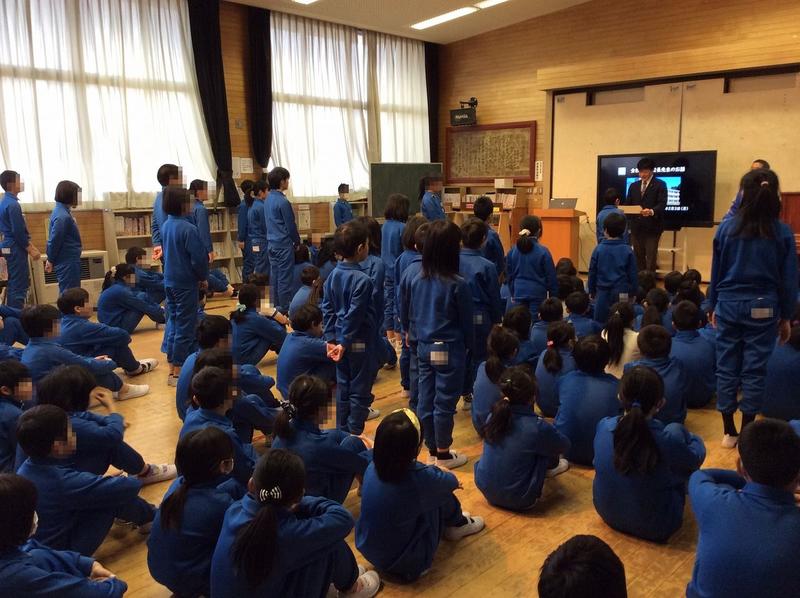 ホールに集まったみなさん。賞状をもらう子も、見守る子も、ピシッとしていて気持ちがいいです。表彰のあとは、校長先生の「クイズ シマオネア ドラえもん クイズ」をみんなで楽しんで、最後に夢をもつことと友情の大切さについてお話ししました。