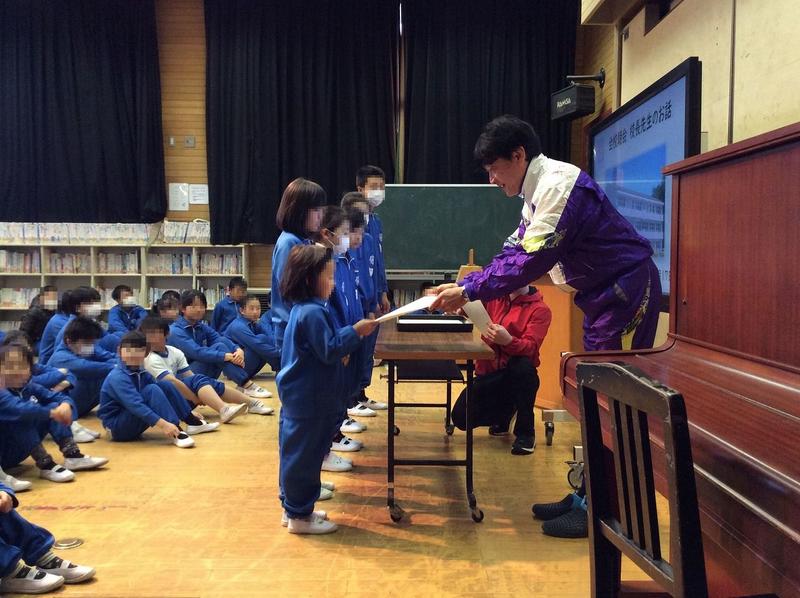はじめに、なわとび記録会の表彰です。各学年、1位になった八幡っ子たちが、校長先生から表彰されました。「たくましい子ども」たち!!本当にがんばりました。